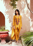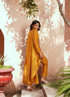 Featured here is yellow gold-toned kurta set that is crafted in printed Chanderi silk and paired with straight-fit pants, both adorned with delicate coin lace detailing at the sleeves and hem. The look is elevated with a flowy asymmetric A-line jacket, intricately embroidered with subtle dori and zardozi work for a touch of refined shimmer. Perfect for festive dinners, cultural events, or intimate celebrations where elegance is key and comfort is effortless.