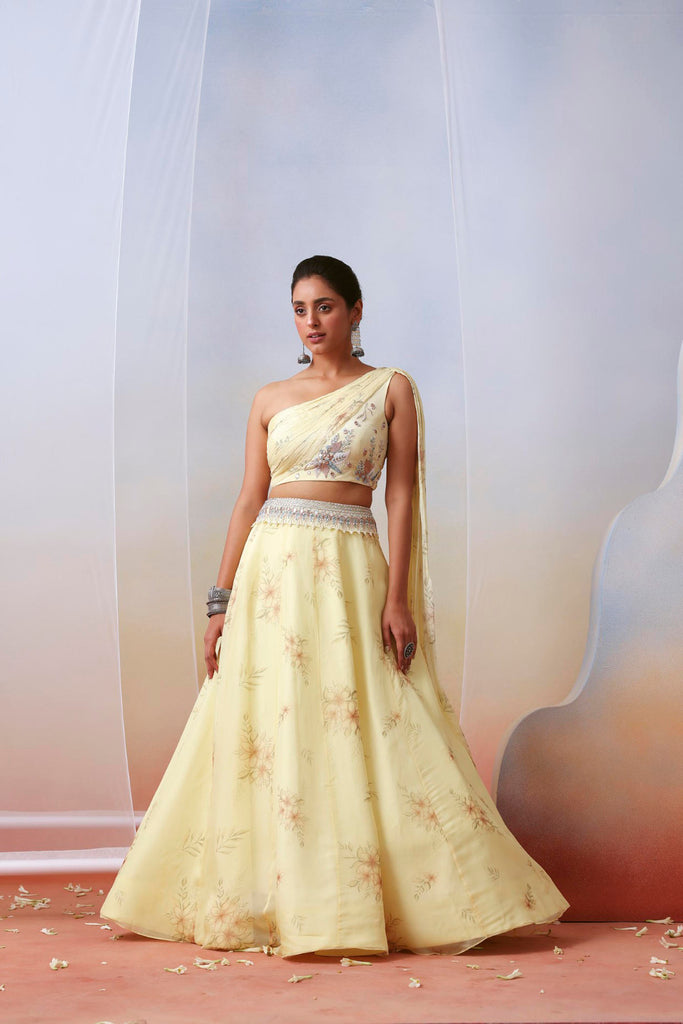 Featured here is off white printed one shoulder lehenga made in organza. It is paired with a ruched and embroidered chiffon blouse and an attached drape dupatta