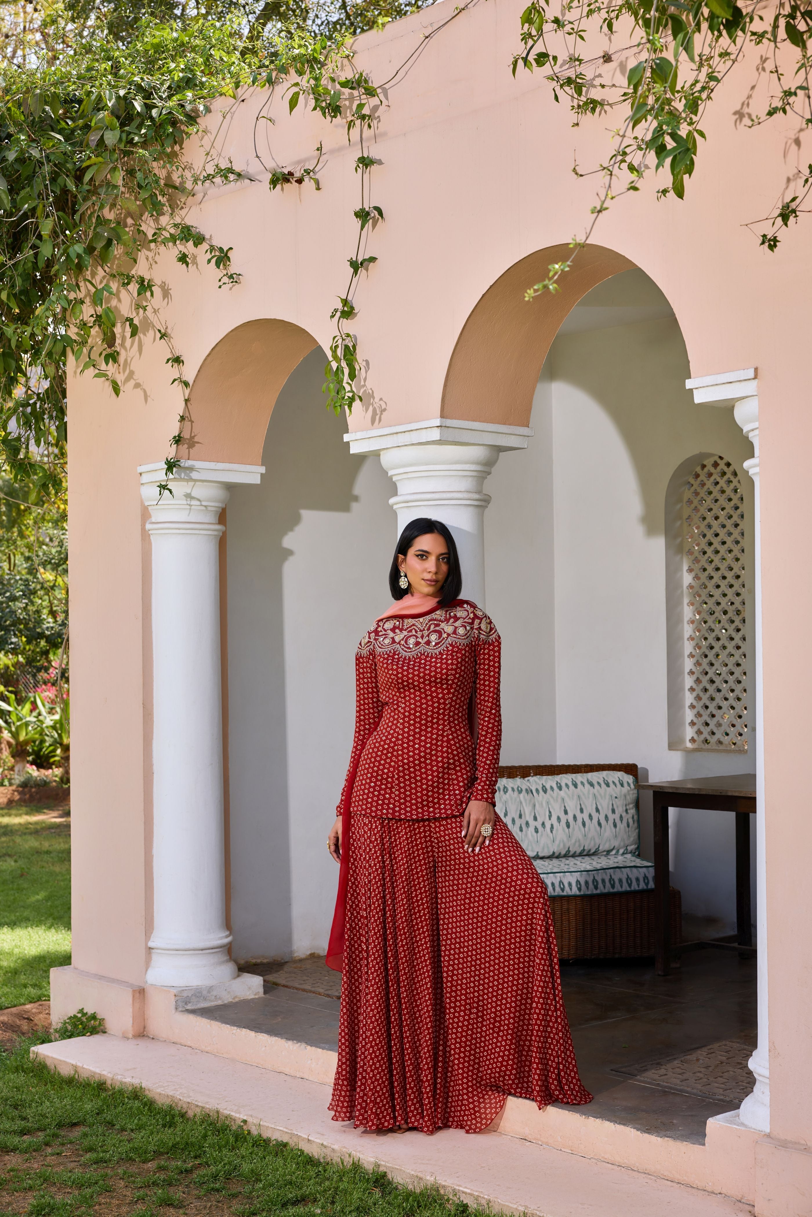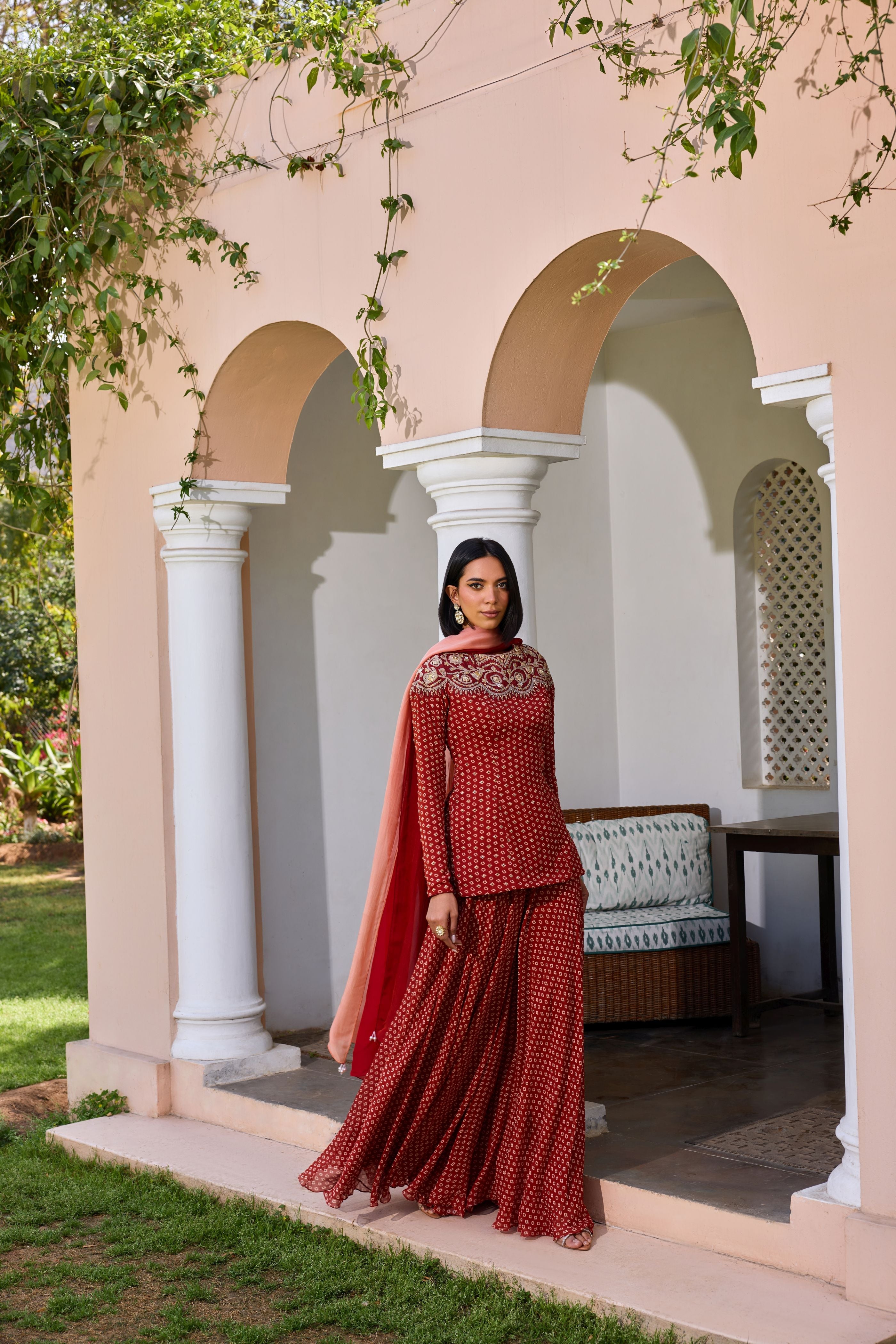 Featuring a Bandhani adorned and dori marodi embroidered sharara set made in georgette. It is paired with an ombre dupatta made in organza. Accessorize this set with polki or pearl studs to ace any festive look.