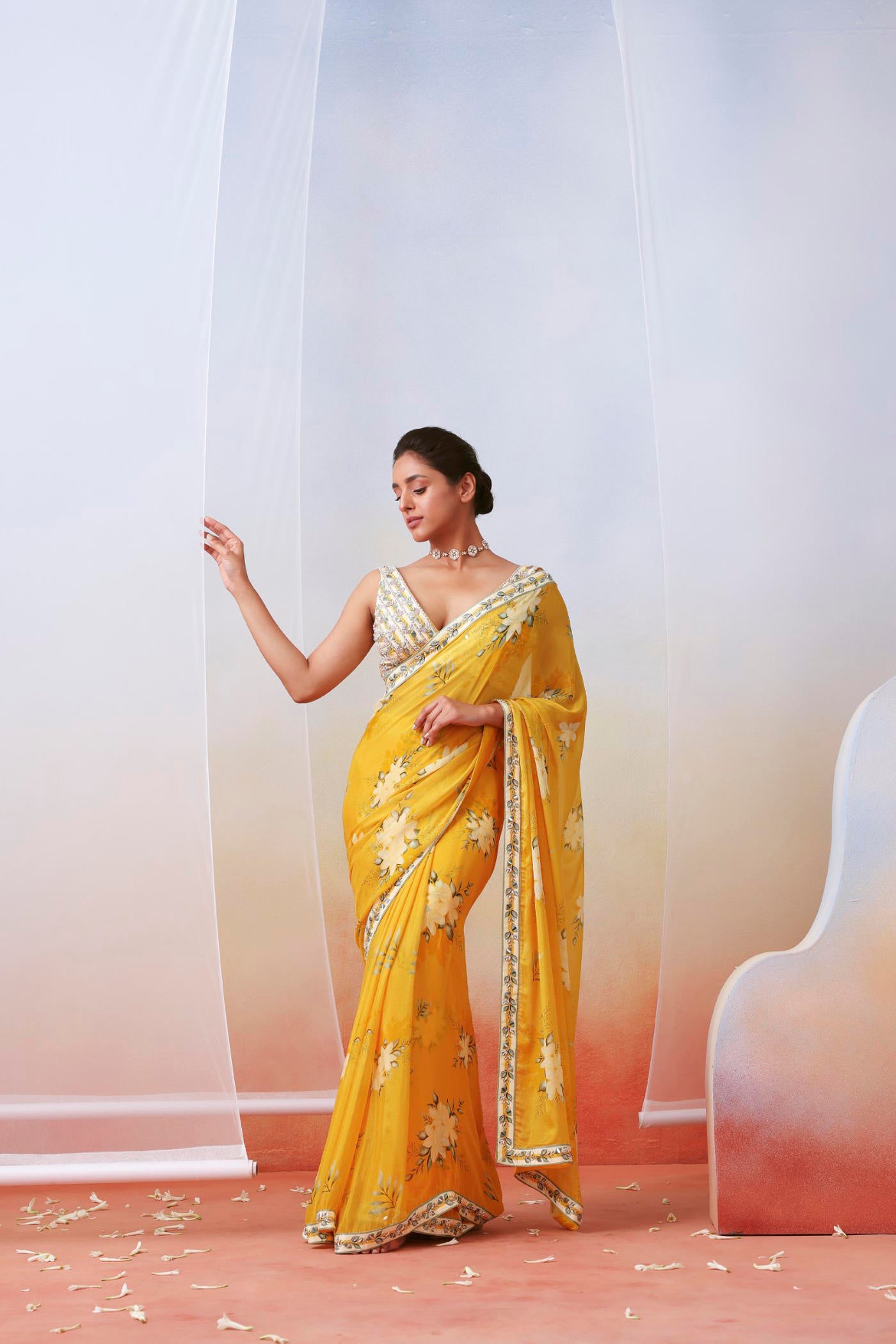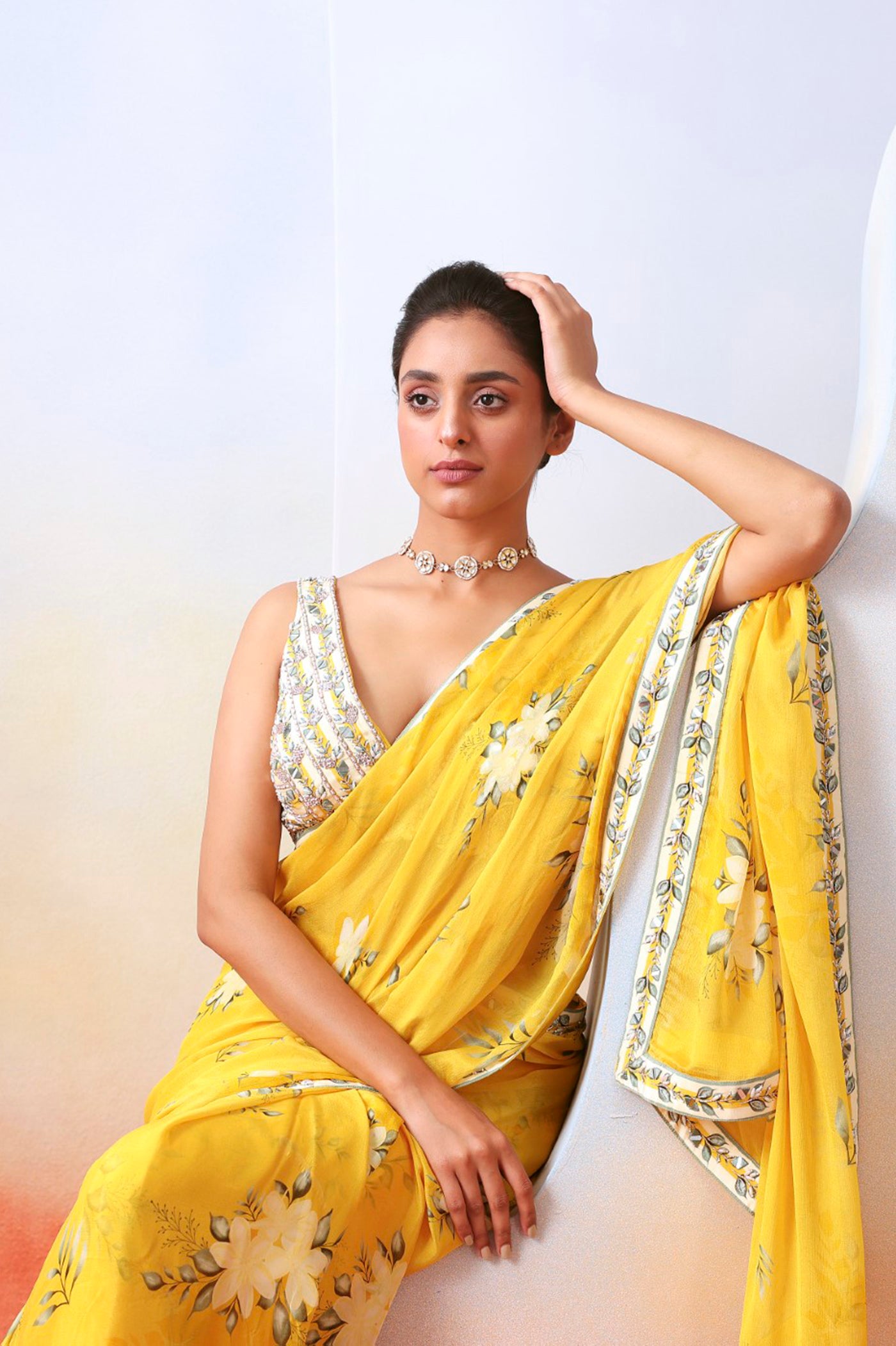 Sakshi Sindwani in Yellow printed embroidered saree set